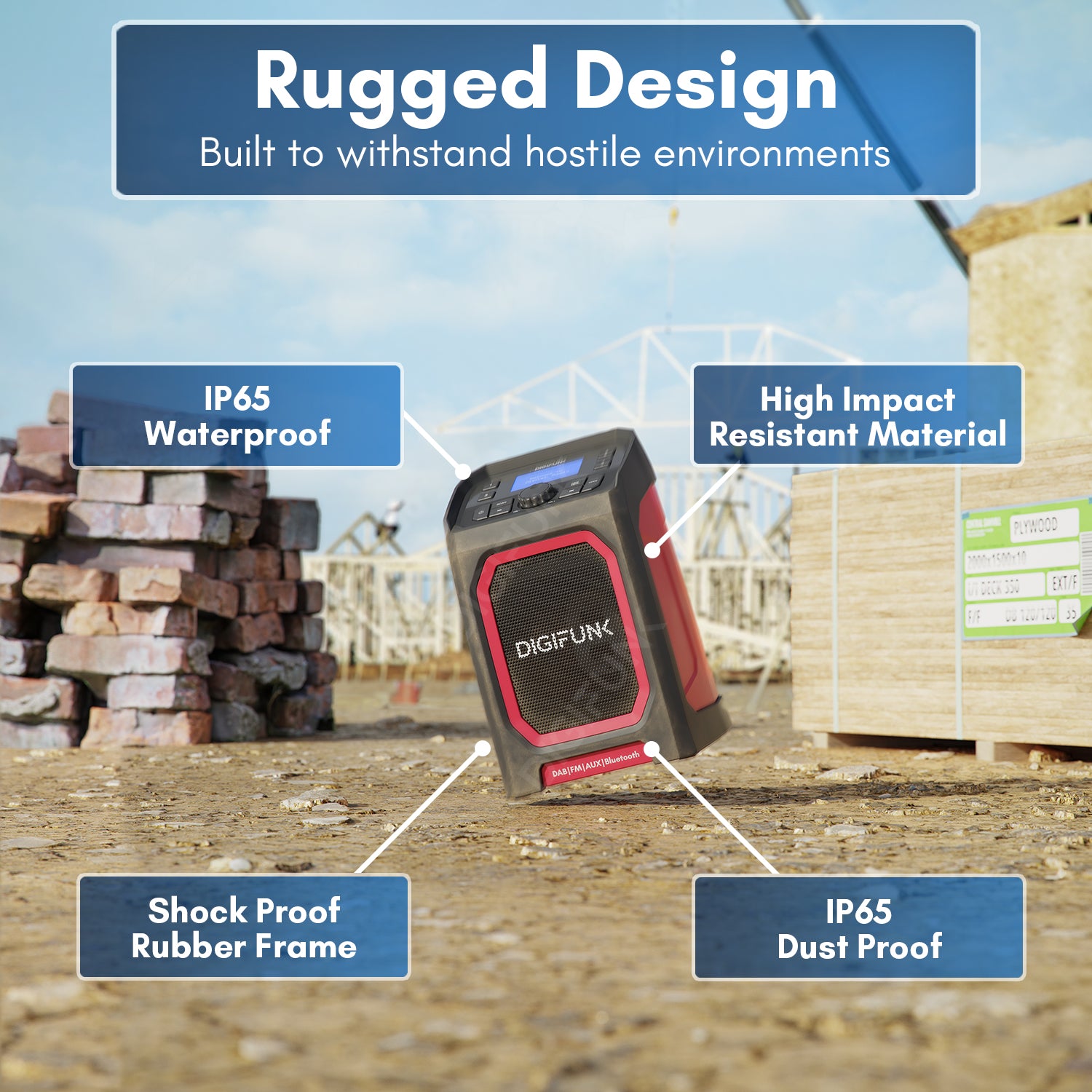 IP65 Certified | Tested and certified to the IP65 standard. It is certified waterproof, dust proof & drop resistant making it the perfect radio for construction sites and other challenging work environments