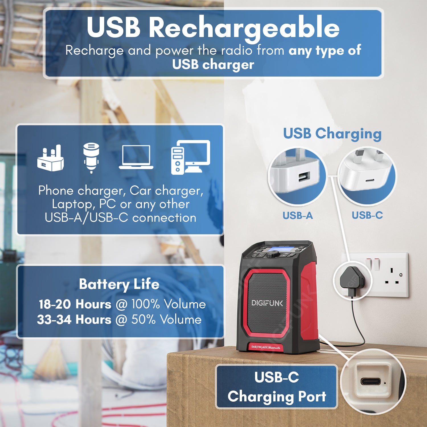 USB C Rechargeable | Features a USB C charging port. You can use ANY type of USB A/C charger to recharge the site radio - Phone, Tablet, Laptop, Car charger etc...